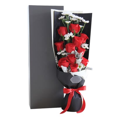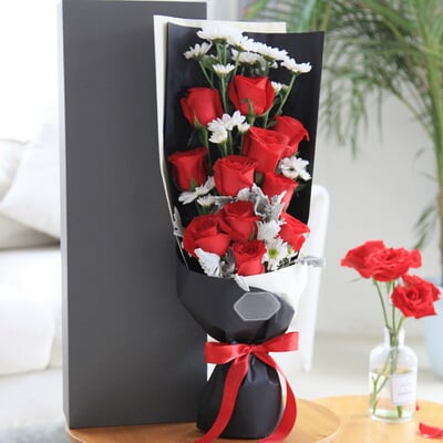花 材卡羅拉紅玫瑰11枝、白色小雛菊4枝、銀葉菊0.5扎,禮盒款