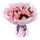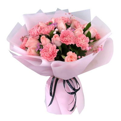 花 材11支粉色康乃馨,11支粉佳人玫瑰,搭配少許相思梅,粉色滿天星,綠葉圓形花束