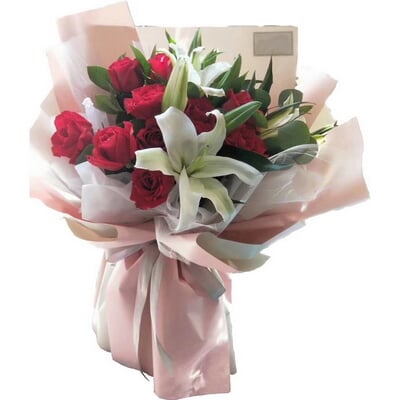 11枝紅玫瑰,3枝多頭白百合