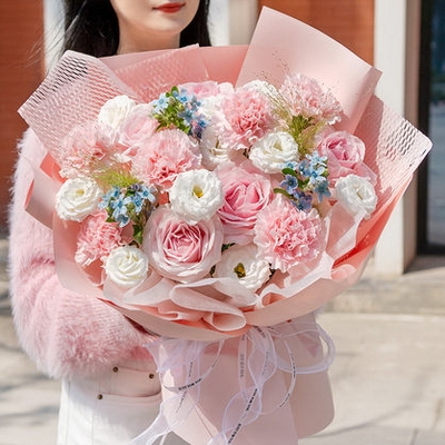花 材7支粉色康乃馨,4支粉玫瑰,白色洋桔梗,藍(lán)星花,綠鈴草等搭配