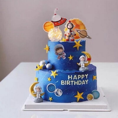 8+12寸雙層宇航員蛋糕,蛋糕表面是宇航員玩偶、星星、氣球等裝飾