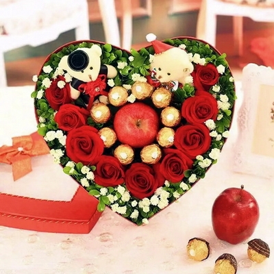 花 材9支紅玫瑰,9顆巧克力,2個蘋果,2個小熊公仔,滿天星點綴