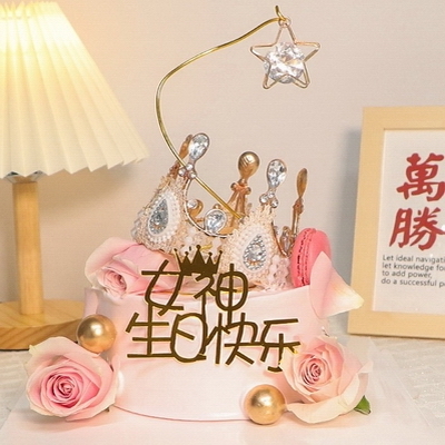現(xiàn)烤蛋糕胚,中層新鮮奶油+應季水果夾心,表層許愿環(huán),玫瑰花,皇冠,馬卡龍餅干等裝飾