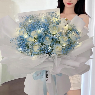 花 材11支碎冰藍玫瑰,1個小熊公仔,彩燈搭配,藍色滿天星豐滿