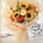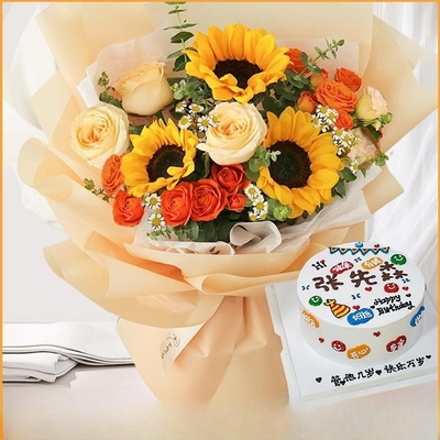 3支香檳玫瑰,3支向日葵,橙色泡泡、洋桔梗、洋甘菊、尤加利葉搭配;圓形水果蛋糕,內(nèi)層新鮮蛋糕胚+奶油疊加(含水果果肉),表層奶油手繪祝福語裝飾