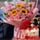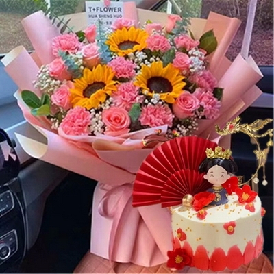 10支粉康,9支粉玫瑰,3支向日葵,白色滿天星間插,尤加利葉、梔子葉搭配;圓形水果蛋糕,現(xiàn)烤蛋糕胚,新鮮水果夾心,優(yōu)質(zhì)奶油疊加,表層中國風主題配件裝飾