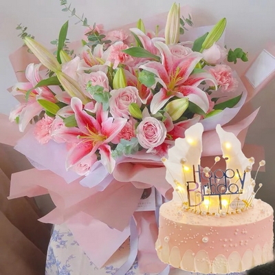 9支粉玫瑰,6支粉康,6支多頭粉百合,尤加利葉間插;圓形皇冠蛋糕,內(nèi)層蛋糕胚+優(yōu)質(zhì)奶油疊加,水果果肉夾層,表層珍珠皇冠、羽毛、彩燈等裝飾