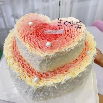 8寸+12寸雙層鮮奶蛋糕,內(nèi)層蛋糕胚+新鮮奶油疊加,新鮮果肉夾層(水果有要求,請下單備注),表層奶油裱玫瑰花,珍珠糖點綴,側(cè)面白色巧克力碎圍邊