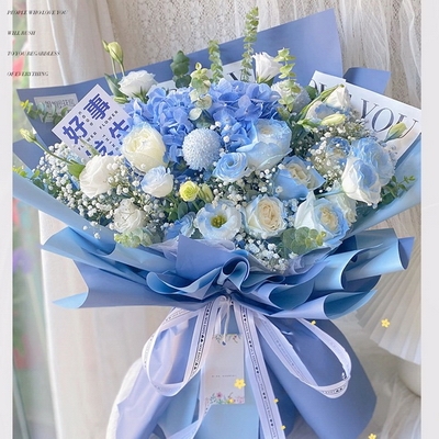 包 裝白色英文包裝紙內(nèi)襯,藍(lán)色霧面紙韓式單面花束,精美絲帶