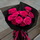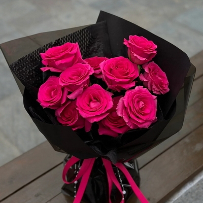 包 裝黑色包裝紙+透明玻璃紙多層韓式包裝,玫粉色花結(jié)束扎