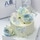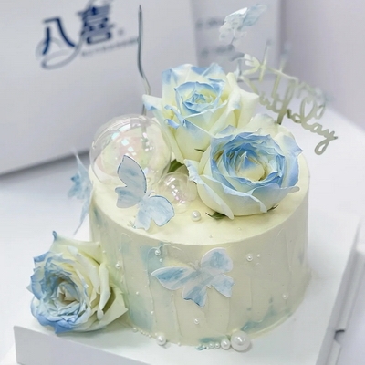 鮮花冰激凌蛋糕,3朵碎冰藍搭配,藍色蝴蝶、透明裝飾球等裝飾