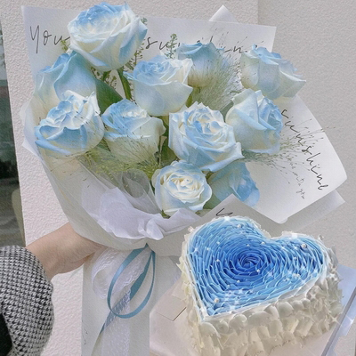 愛人水果心形鮮奶花瓣造型蛋糕;11朵碎冰藍玫瑰