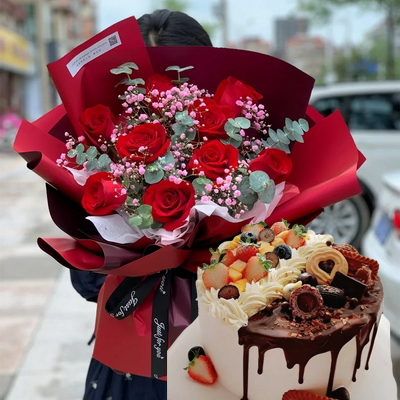 底部現(xiàn)烤蛋糕胚,中層新鮮水果夾心,表層時(shí)令水果,巧克力醬淋面,巧克力,餅干等裝飾;11朵紅玫瑰,粉色滿天星、尤加利葉間插
