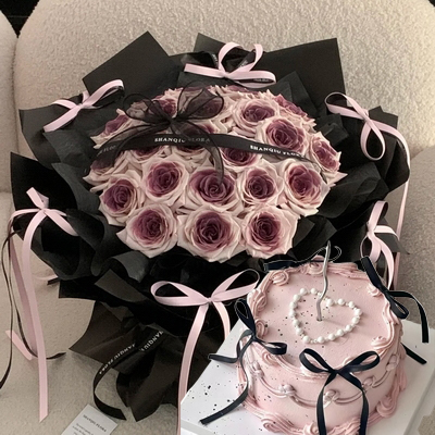 鮮花包裝:黑色綿紙打底,黑色珠光紙,黑粉雙色蝴蝶結芭蕾風包裝,同色系精美蝴蝶結束扎蛋糕:免費贈送一次性刀,叉,盤,蠟燭,生日帽以及精美賀卡