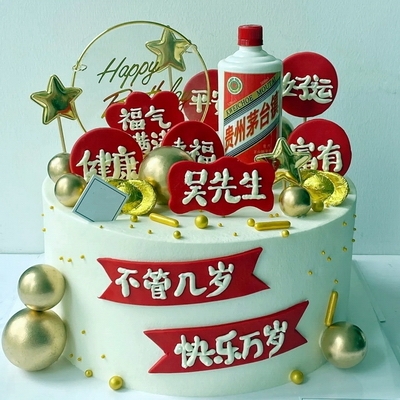圓形網(wǎng)紅蛋糕,新鮮水果夾層,翻糖祝福牌、裝飾茅臺(tái)酒、金元寶等搭配