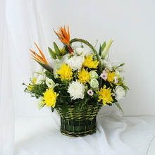 黃菊10枝,白菊8枝,白百合2枝,花籃插花